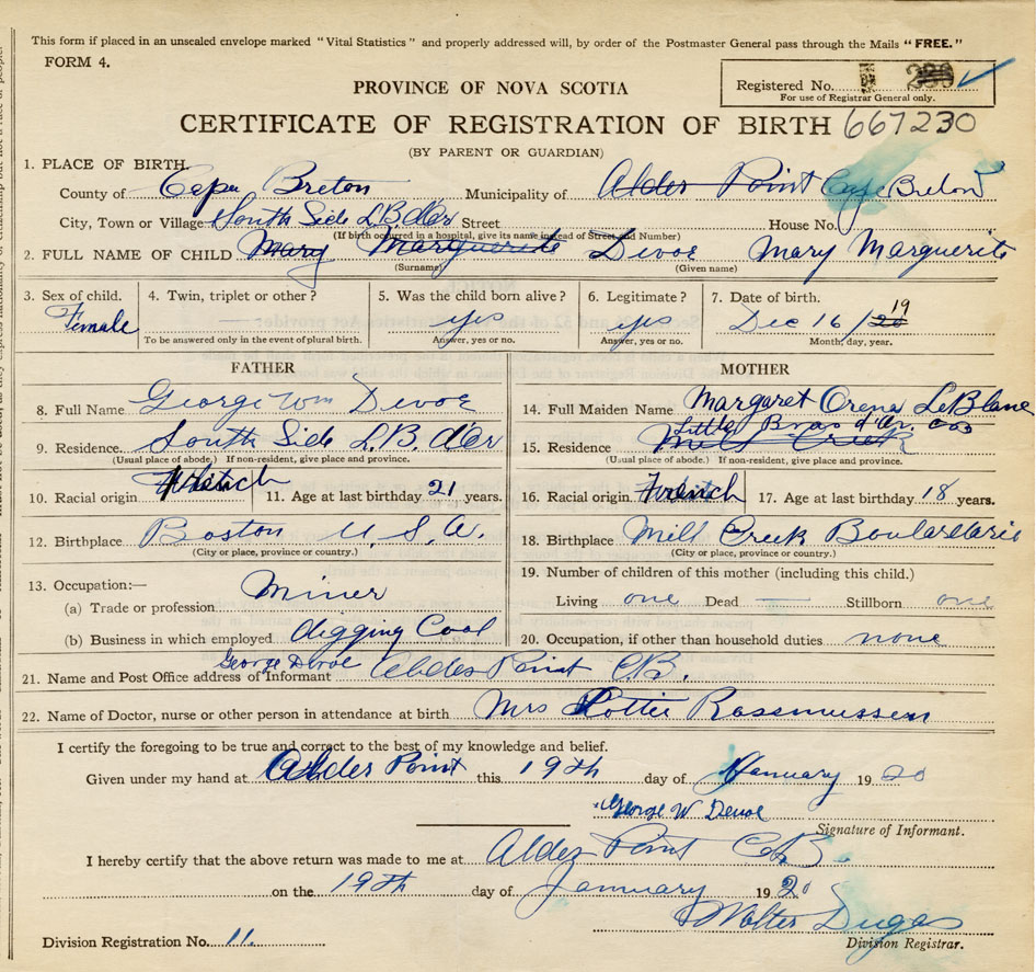 Name of Father George William Devoe MAIDEN NAME of Mother Margaret Orena LeBlanc