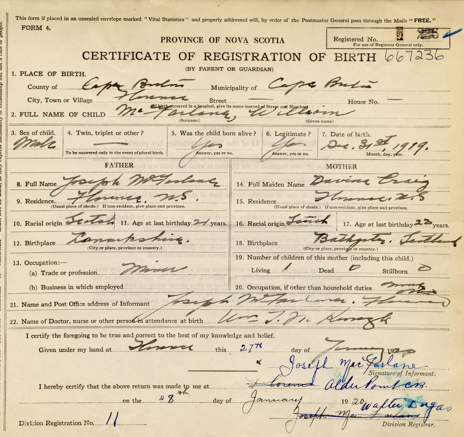 Date of Birth December 31, 1919 Place of Birth FlorenceCounty of Cape Breton