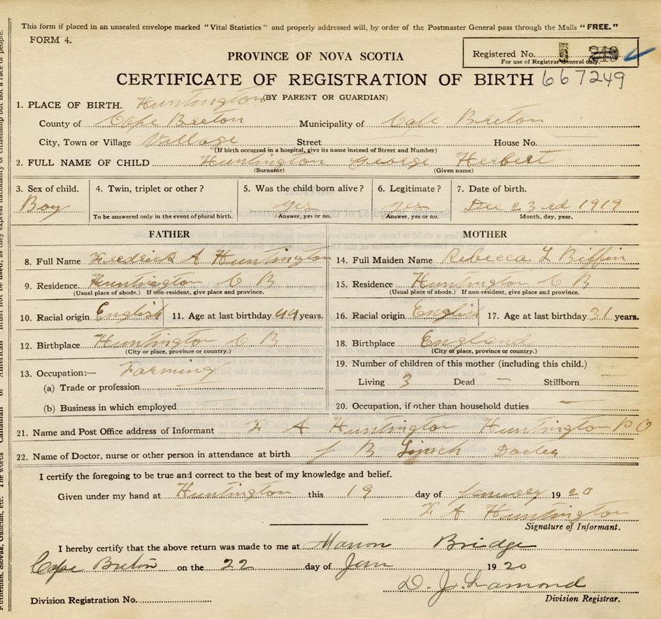 Date of Birth December 23, 1919 Place of Birth HuntingtonCounty of Cape Breton