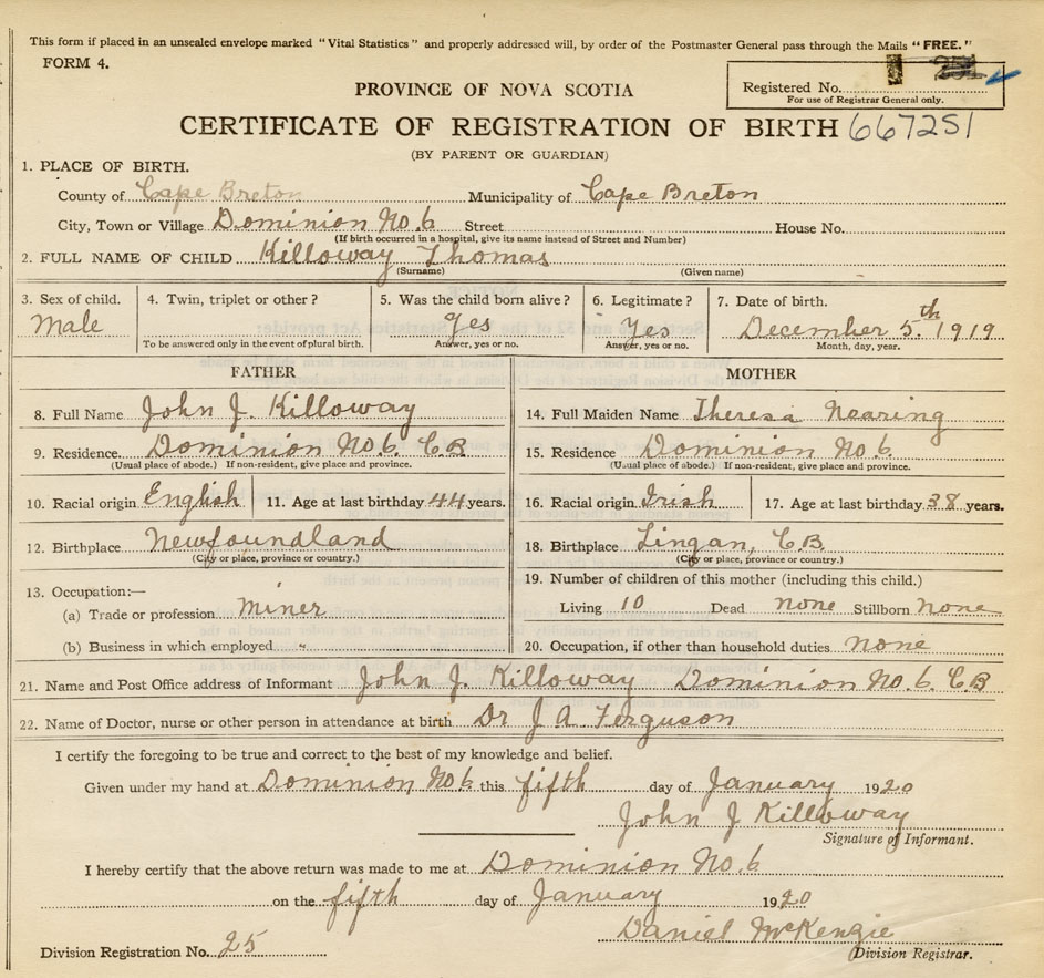 Born at Dominion in the County of Cape Breton