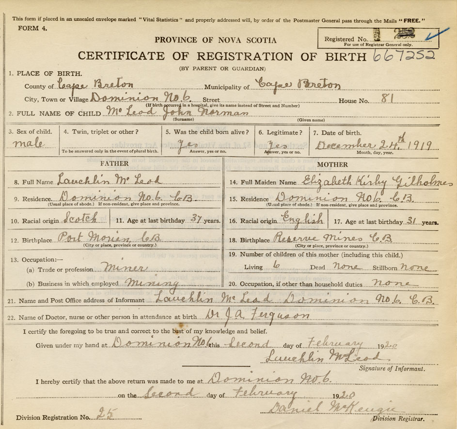Born at Dominion in the County of Cape Breton
