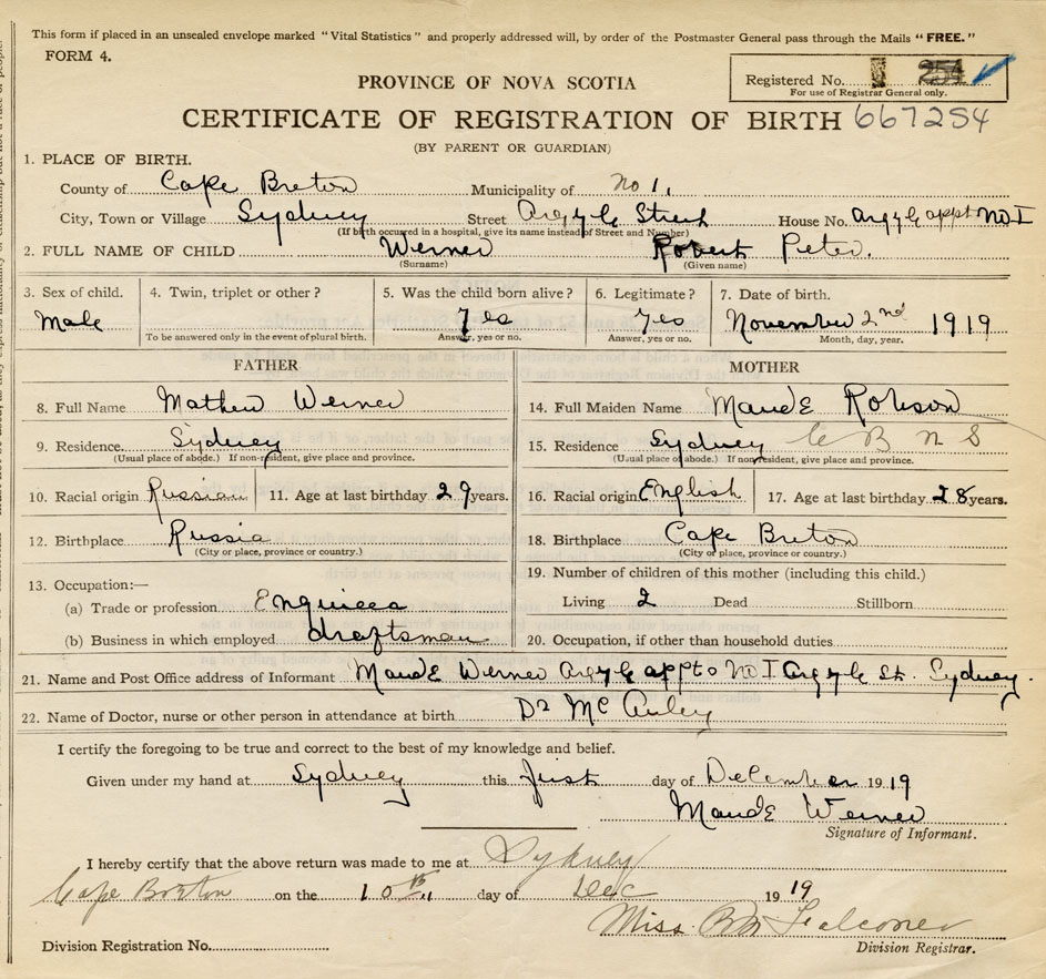 Born at Sydney in the County of Cape Breton