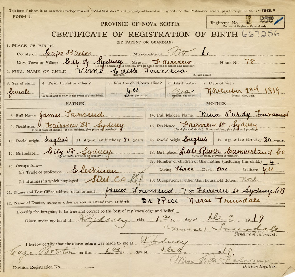 I hereby make application for the Registration of Birth of Verne EdithTownsend Sex Female