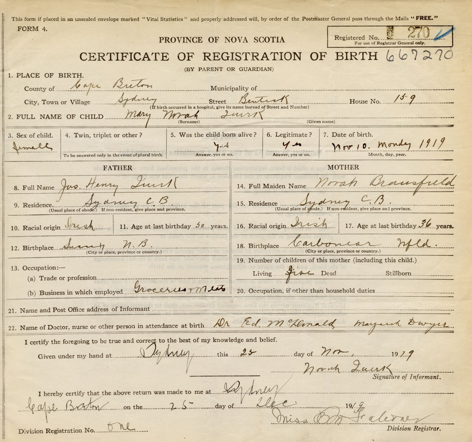 Date of Birth November 10, 1919 Place of Birth SydneyCounty of Cape Breton