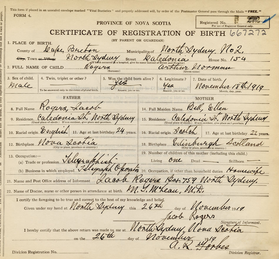 Date of Birth November 18, 1919 Place of Birth SydneyCounty of Cape Breton