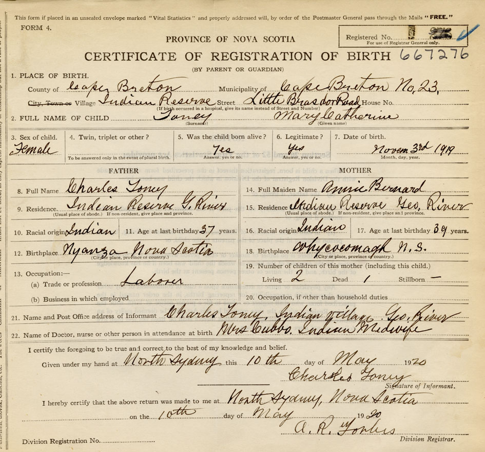 born at Indian Reserve Cape Breton County on November 3, 1919