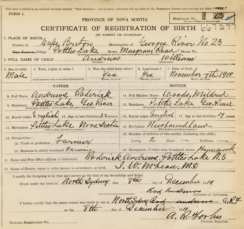 Date of Birth November 7, 1919 Place of Birth Pottles LakeCounty of Cape Breton