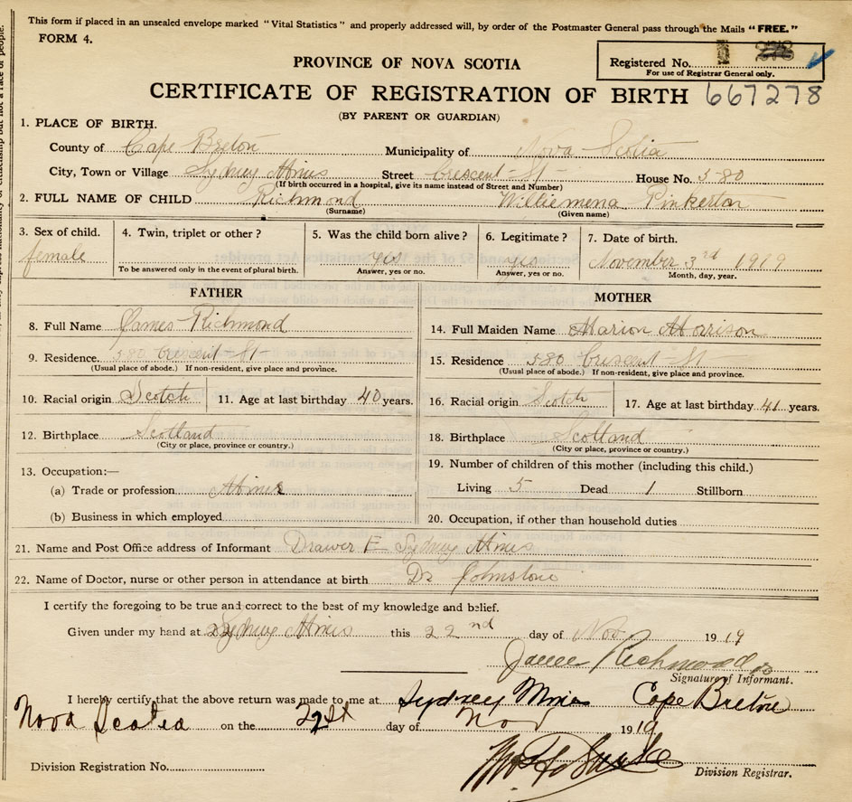 Born at Sydney Mines in the County of Cape Breton