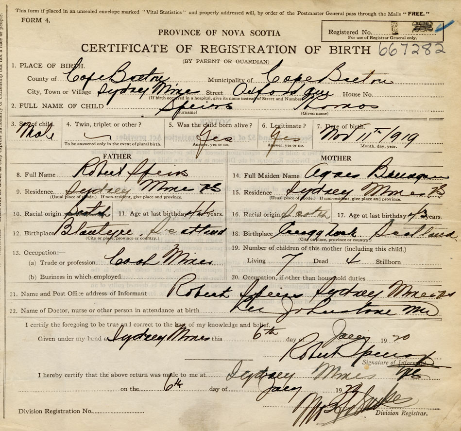 born at Sydney Mines Cape Breton County on November 11, 1919