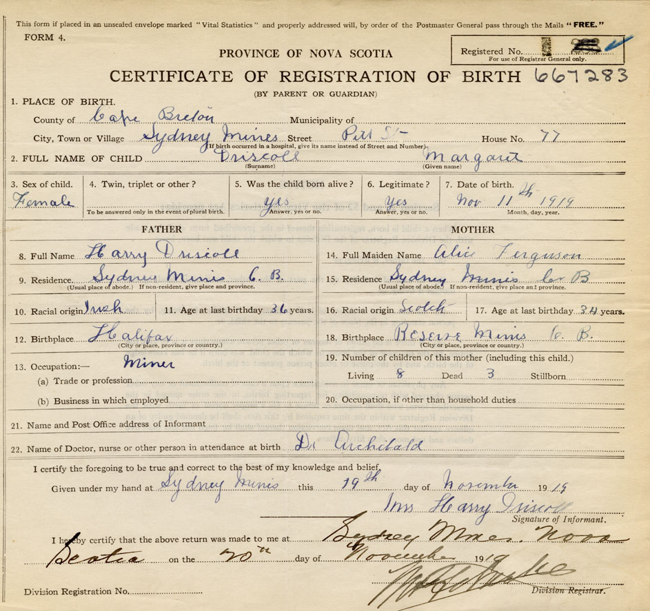 born at Sydney Mines Cape Breton County on November 11, 1919