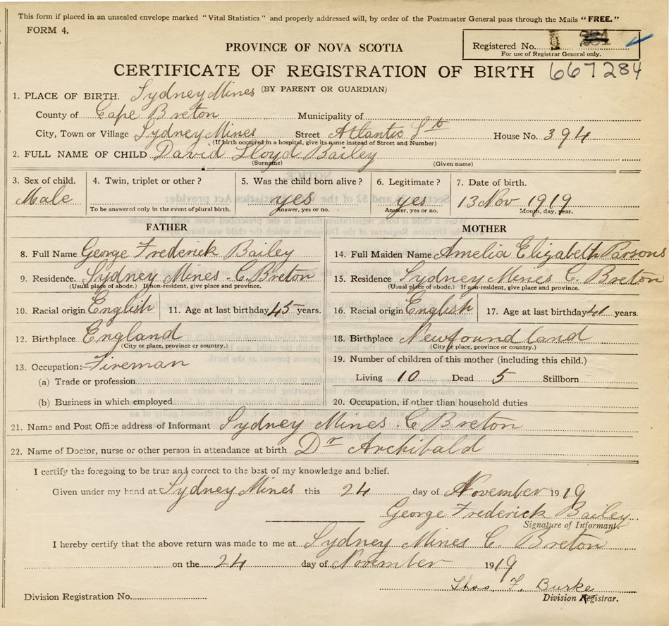born at Sydney Mines Cape Breton County on November 13, 1919