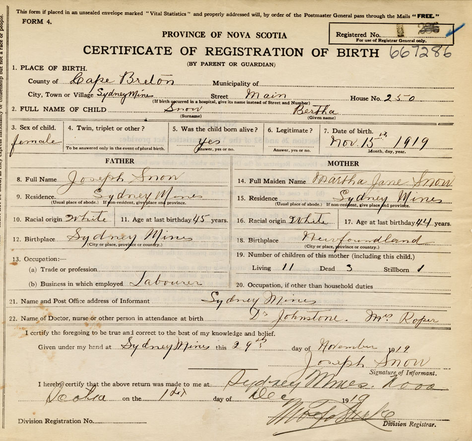 Born at Sydney Mines in the County of Cape Breton