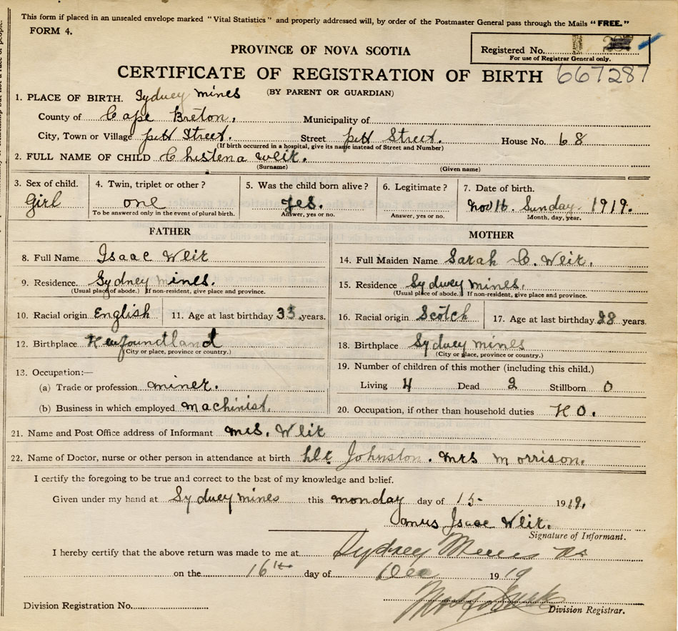 born at Sydney Mines Cape Breton County on November 16, 1919