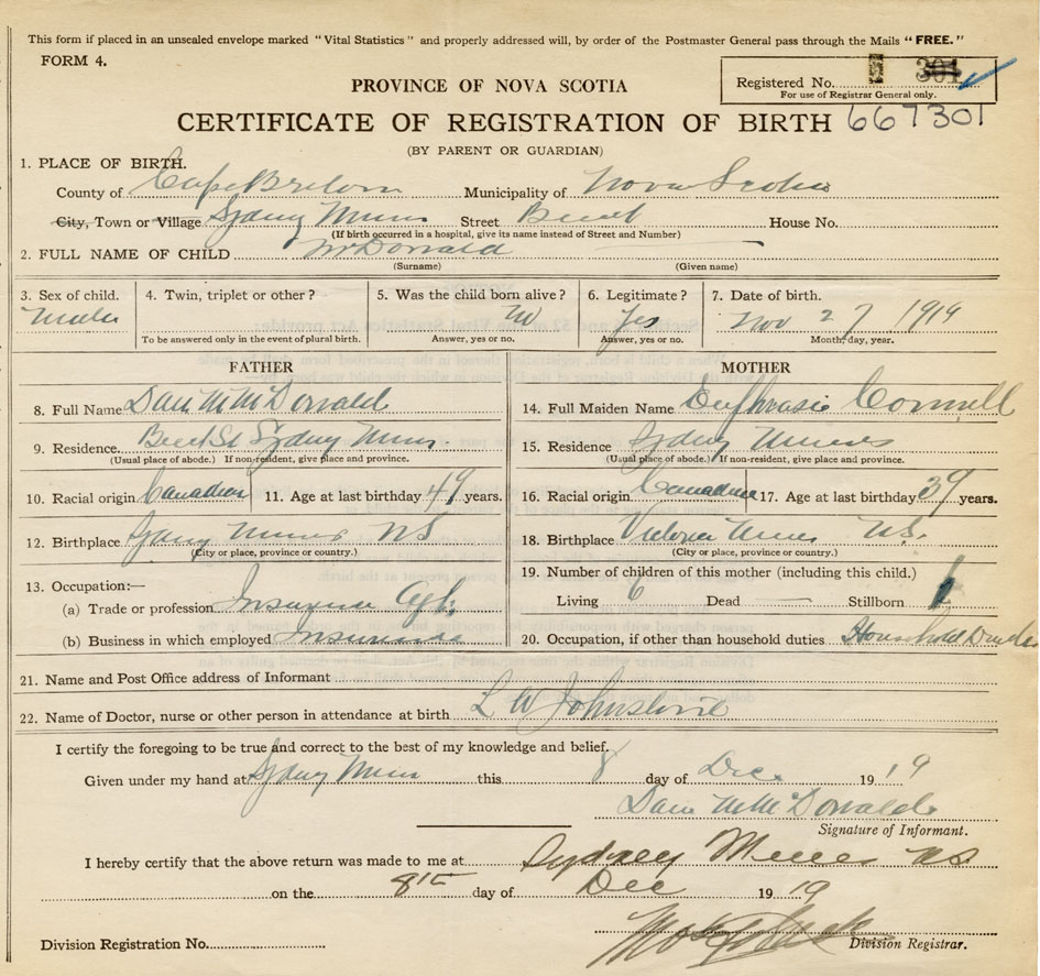 born at Sydney Mines Cape Breton County on November 27, 1919