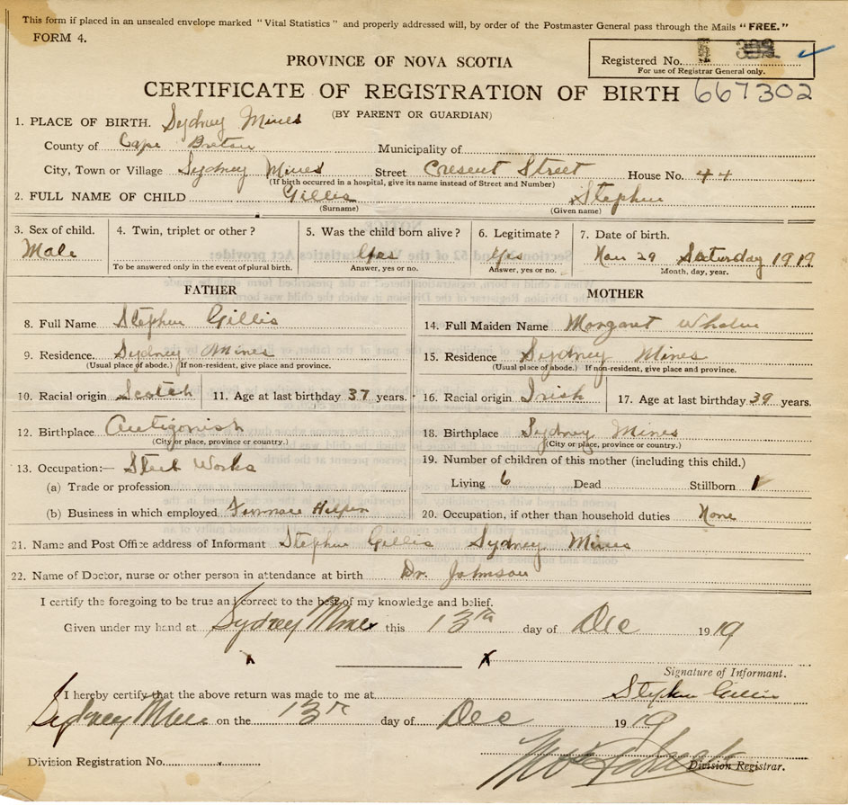 Born at Sydney Mines in the County of Cape Breton