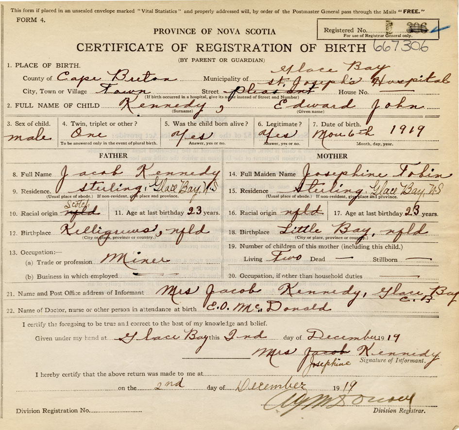 Date of Birth November 6, 1919 Place of Birth Glace BayCounty of Cape Breton