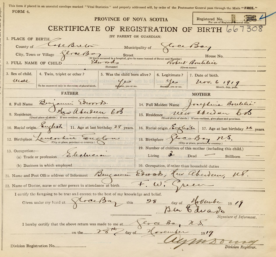 Name of Father Benjamin Edwards MAIDEN NAME of Mother Josephine Boutilier