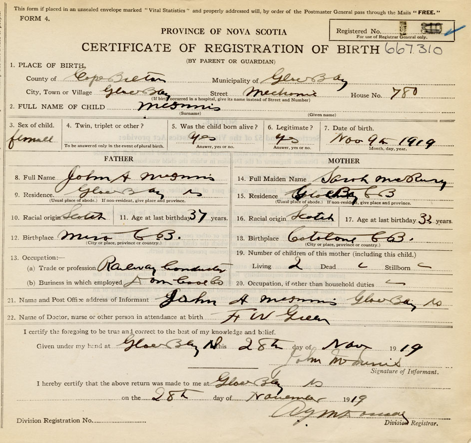 Name of Father John Alexander MacInnis MAIDEN NAME of Mother Sarah Elizabeth MacRury