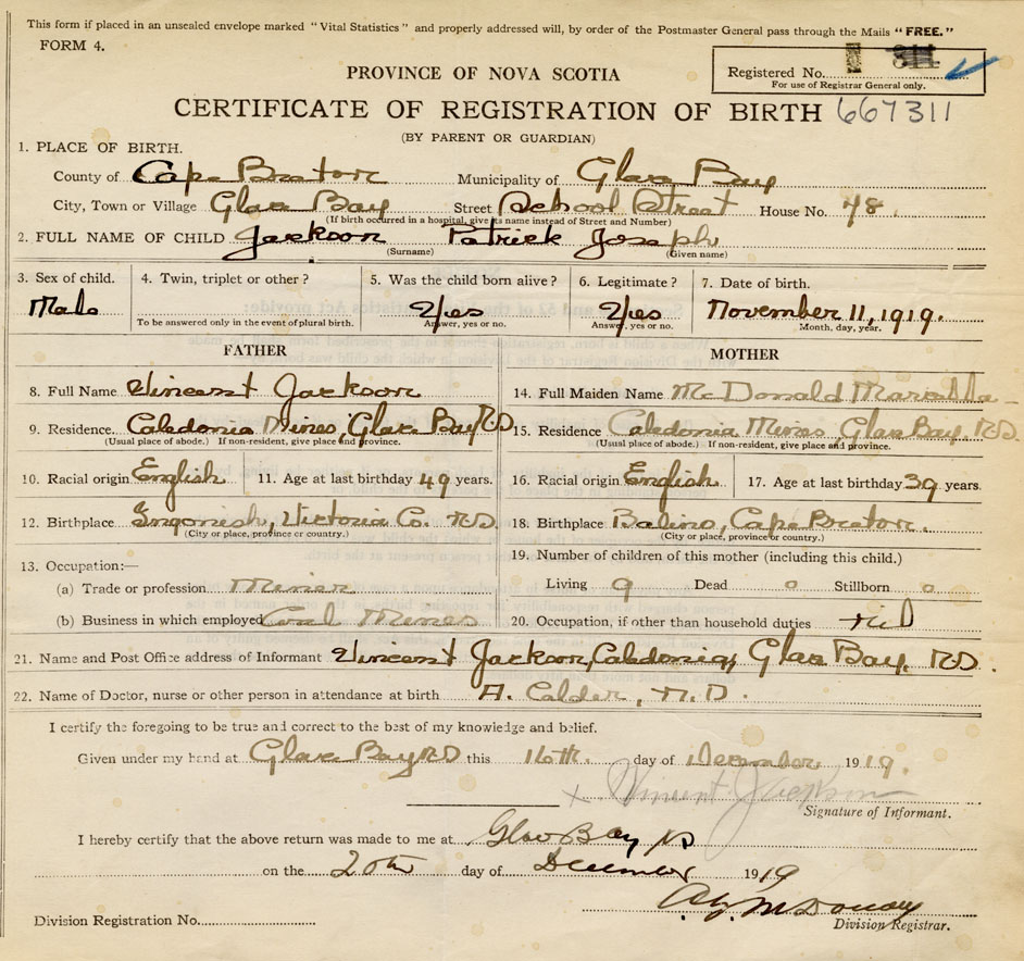 Date of Birth November 11, 1919 Place of Birth Glace BayCounty of Cape Breton