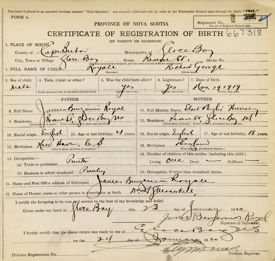 Date of Birth November 19, 1919 Place of Birth Glace BayCounty of Cape Breton