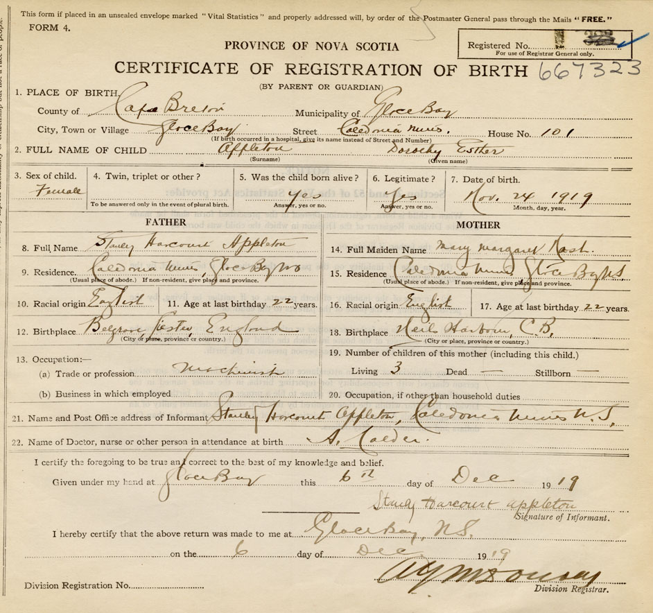 Date of Birth November 24, 1919 Place of Birth Glace BayCounty of Cape Breton