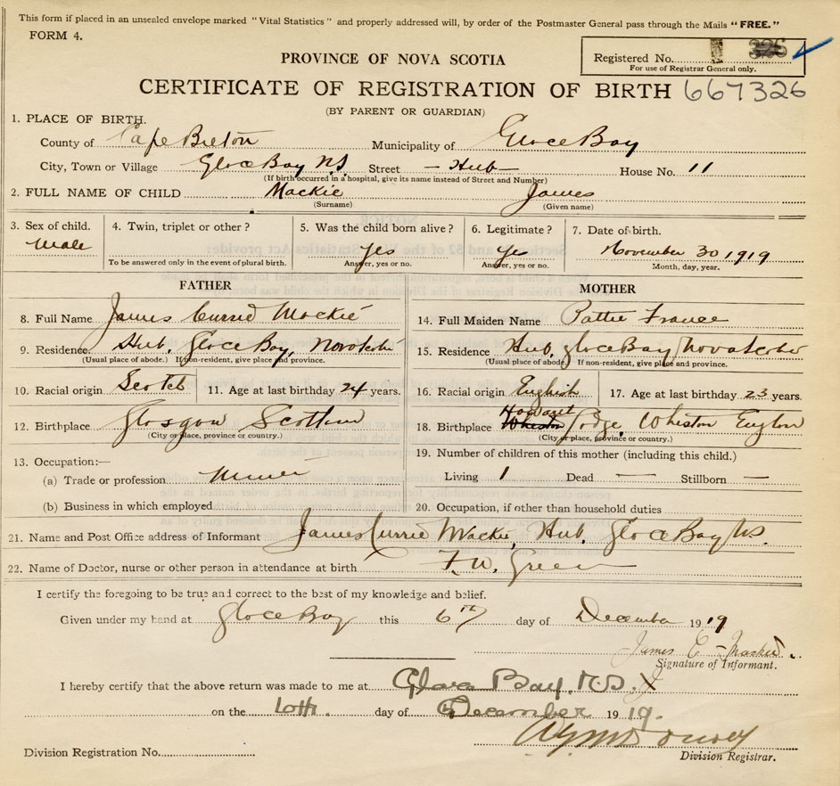 Date of Birth November 30, 1919 Place of Birth Glace BayCounty of Cape Breton