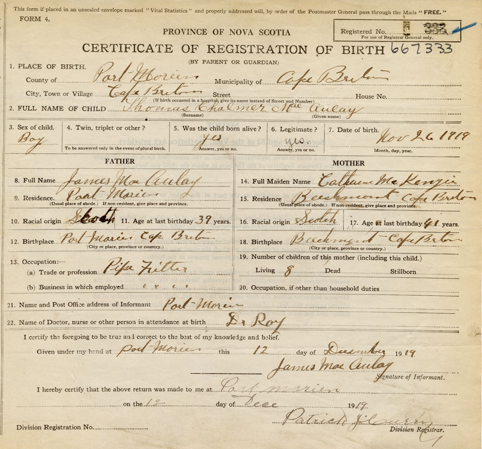 Name of Father James MacAulay MAIDEN NAME of Mother Catherine McKenzie