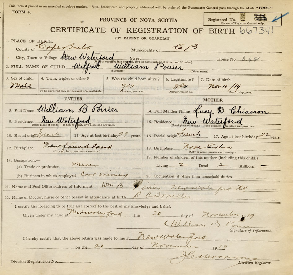 Date of Birth November 10, 1919 Place of Birth New WaterfordCounty of Cape Breton