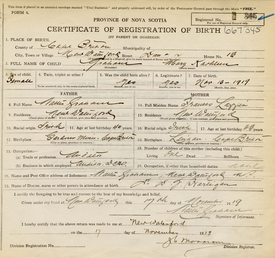 Date of Birth November 13, 1919 Place of Birth New WaterfordCounty of Cape Breton