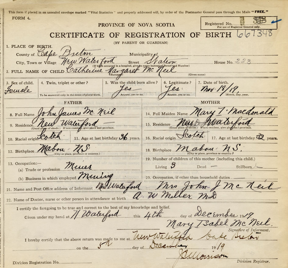 Name of Father John James McNeil MAIDEN NAME of Mother Mary MacDonald