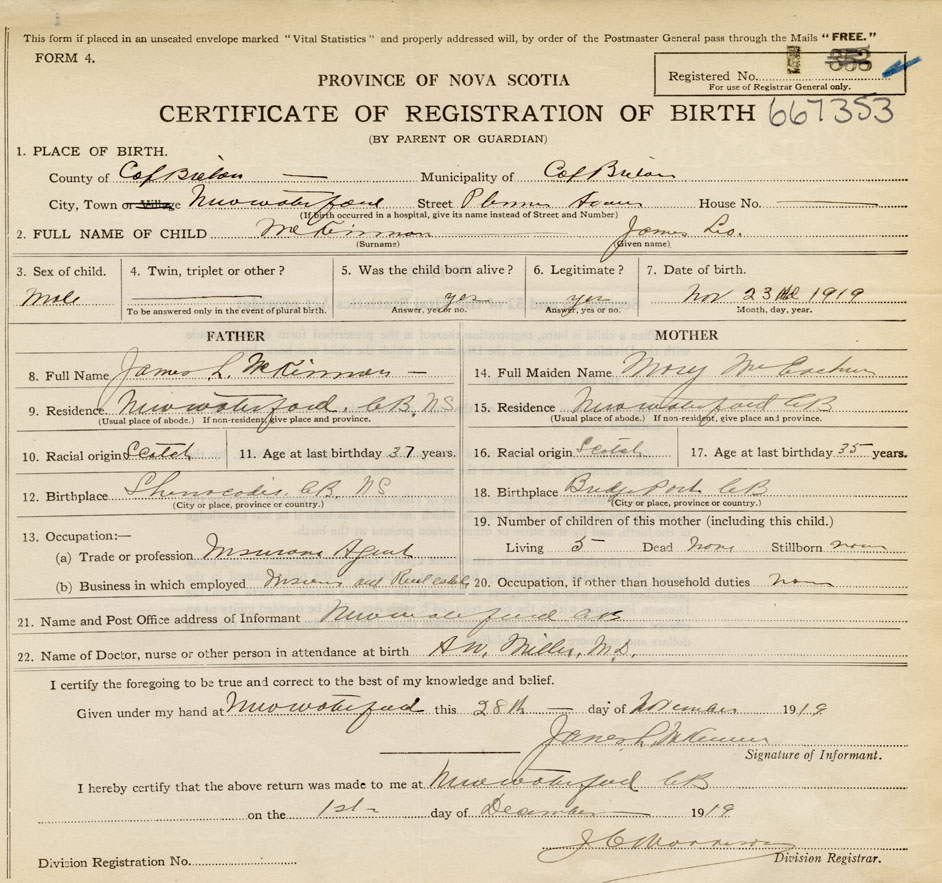 Date of Birth November 23, 1919 Place of Birth New WaterfordCounty of Cape Breton