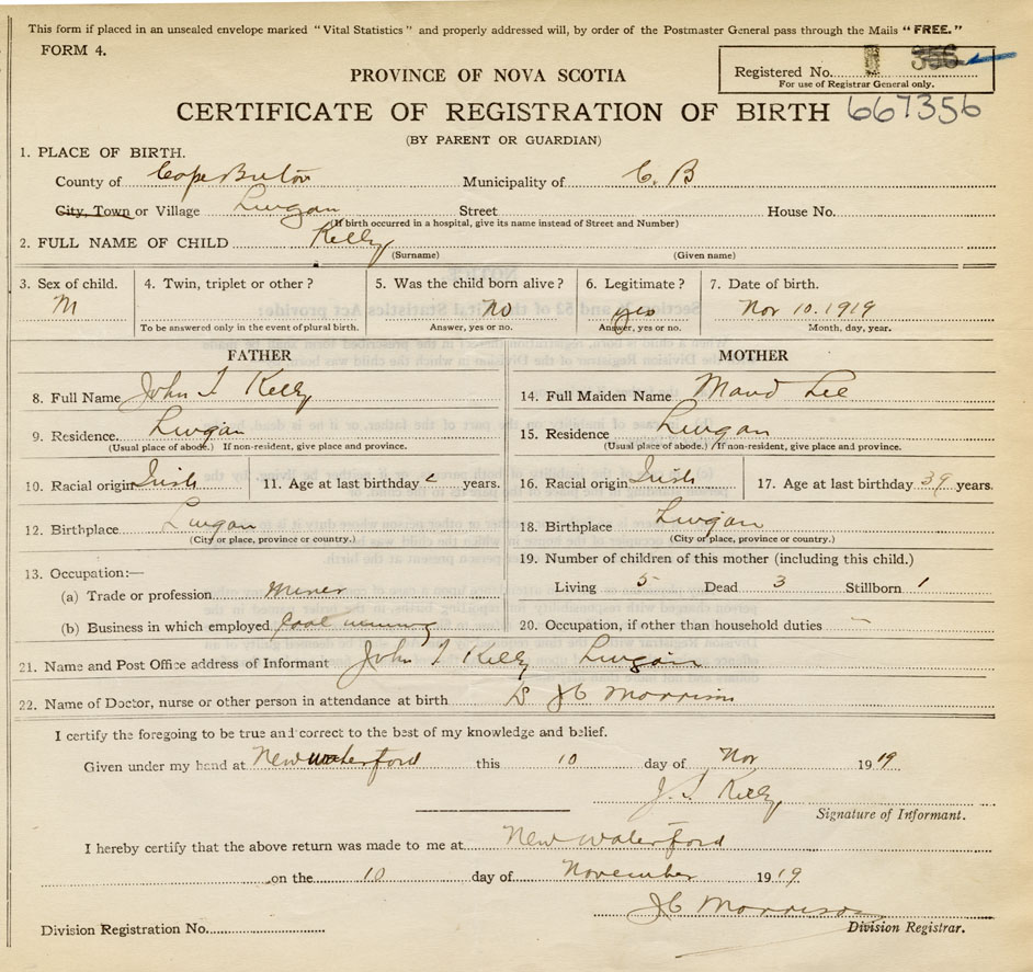 Date of Birth November 10, 1919 Place of Birth LinganCounty of Cape Breton
