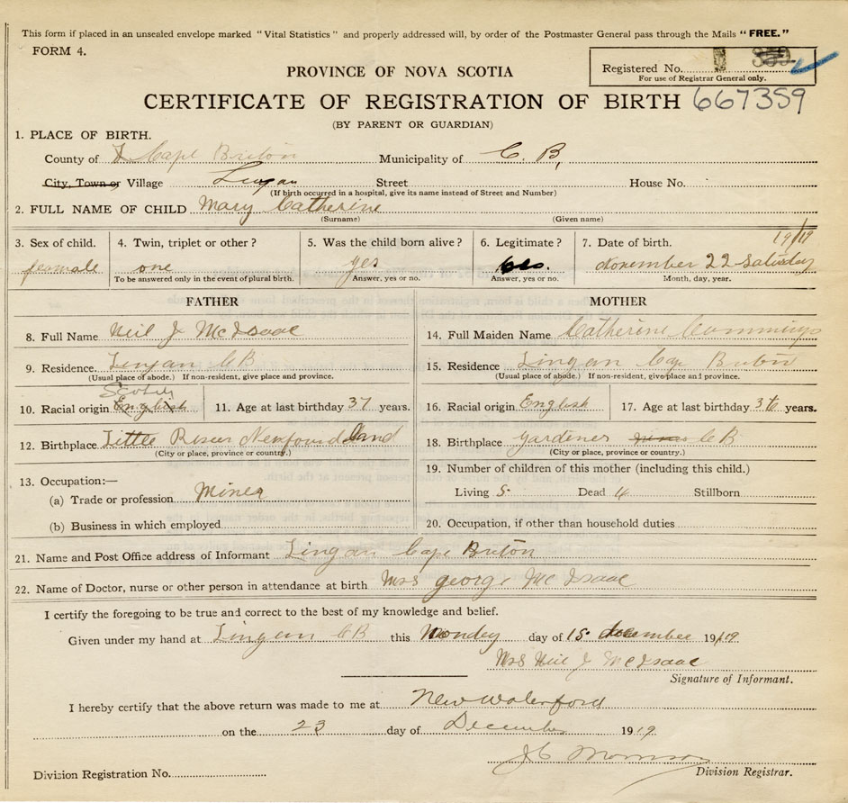 Date of Birth November 22, 1919 Place of Birth LinganCounty of Cape Breton