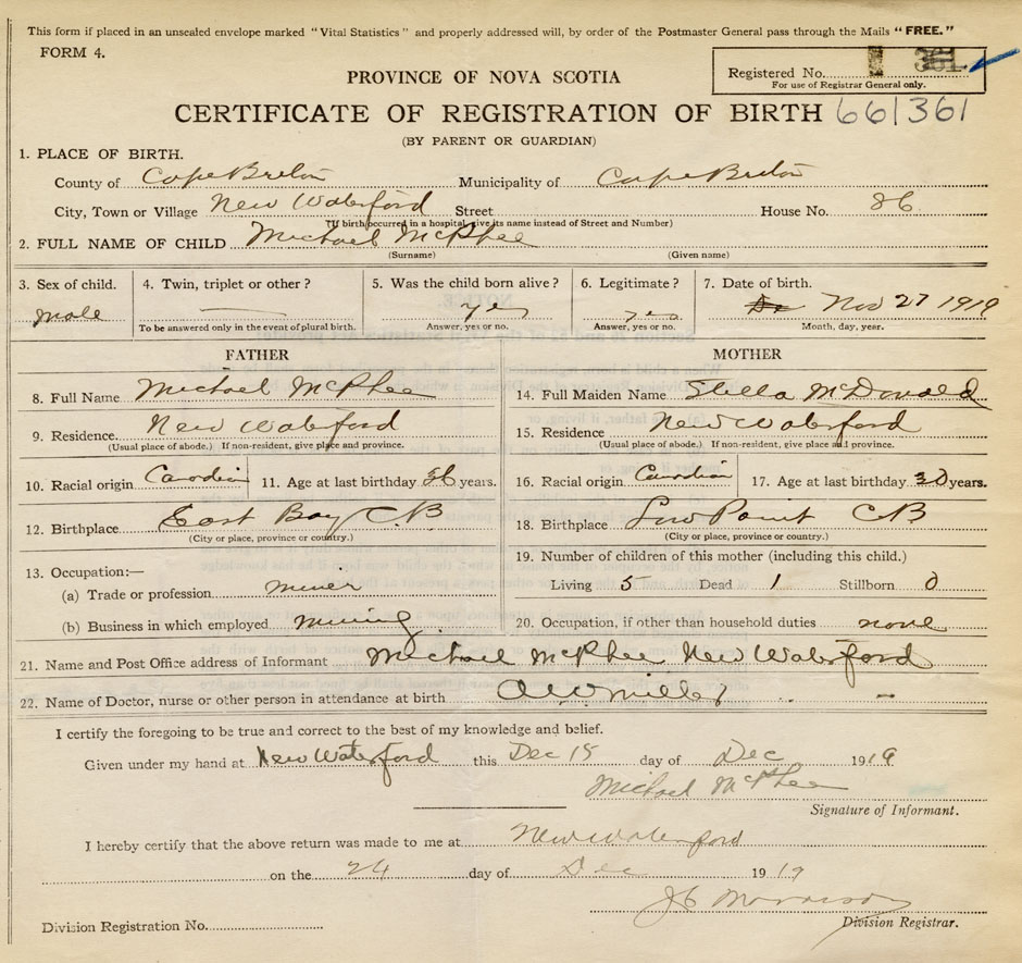Born at New Waterford in the County of Cape Breton
