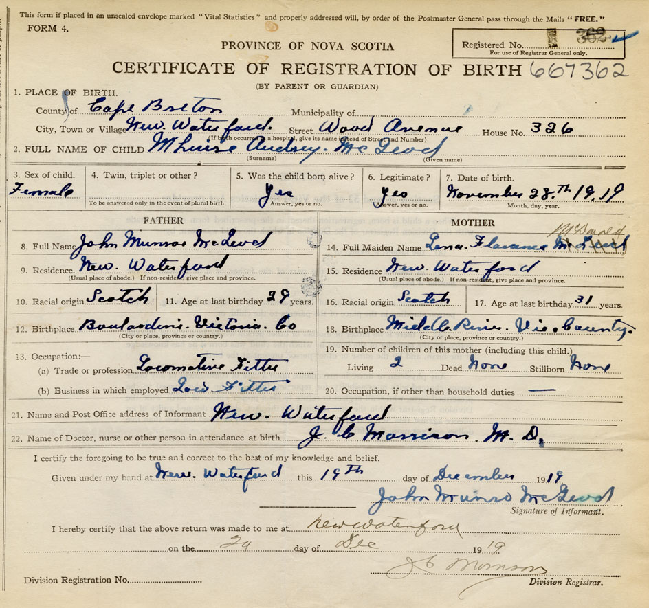 Name of Father John Munroe McLeod MAIDEN NAME of Mother Lena Florence McDonald
