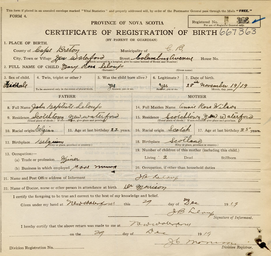 Date of Birth November 28, 1919 Place of Birth New WaterfordCounty of Cape Breton