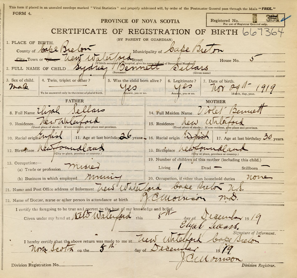 Date of Birth November 29, 1919 Place of Birth New WaterfordCounty of Cape Breton