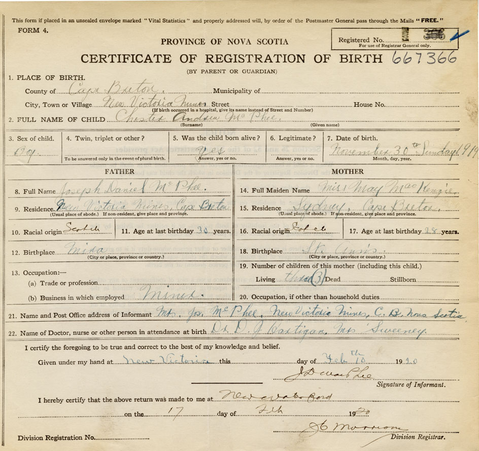 I hereby make application for the Registration of Birth of Chester AndrewMcPhee Sex Male