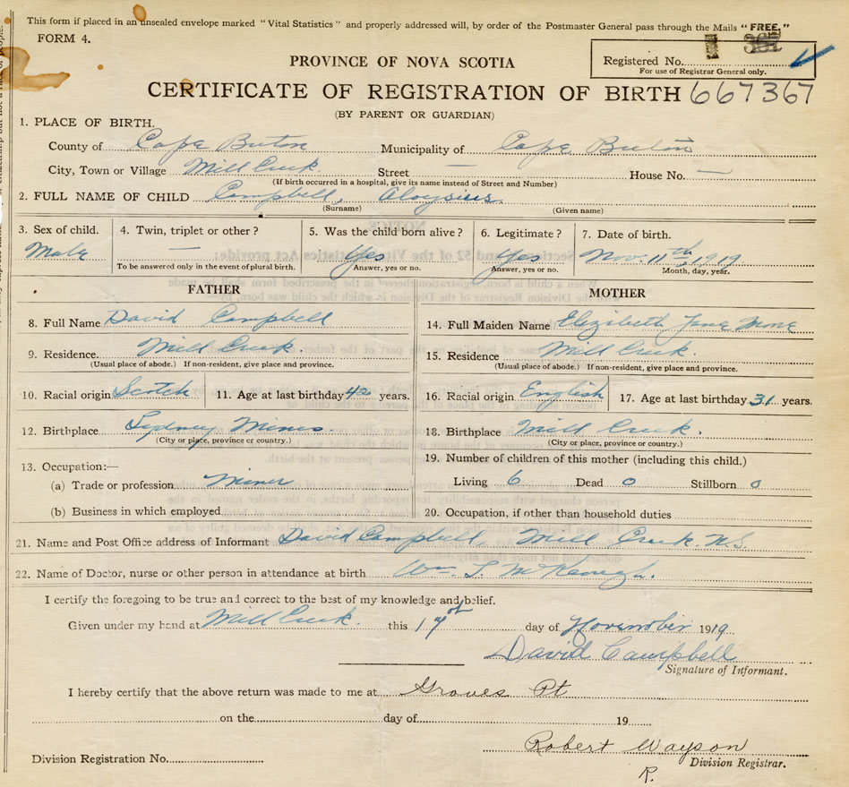 Date of Birth November 11, 1919 Place of Birth Mill CreekCounty of Cape Breton