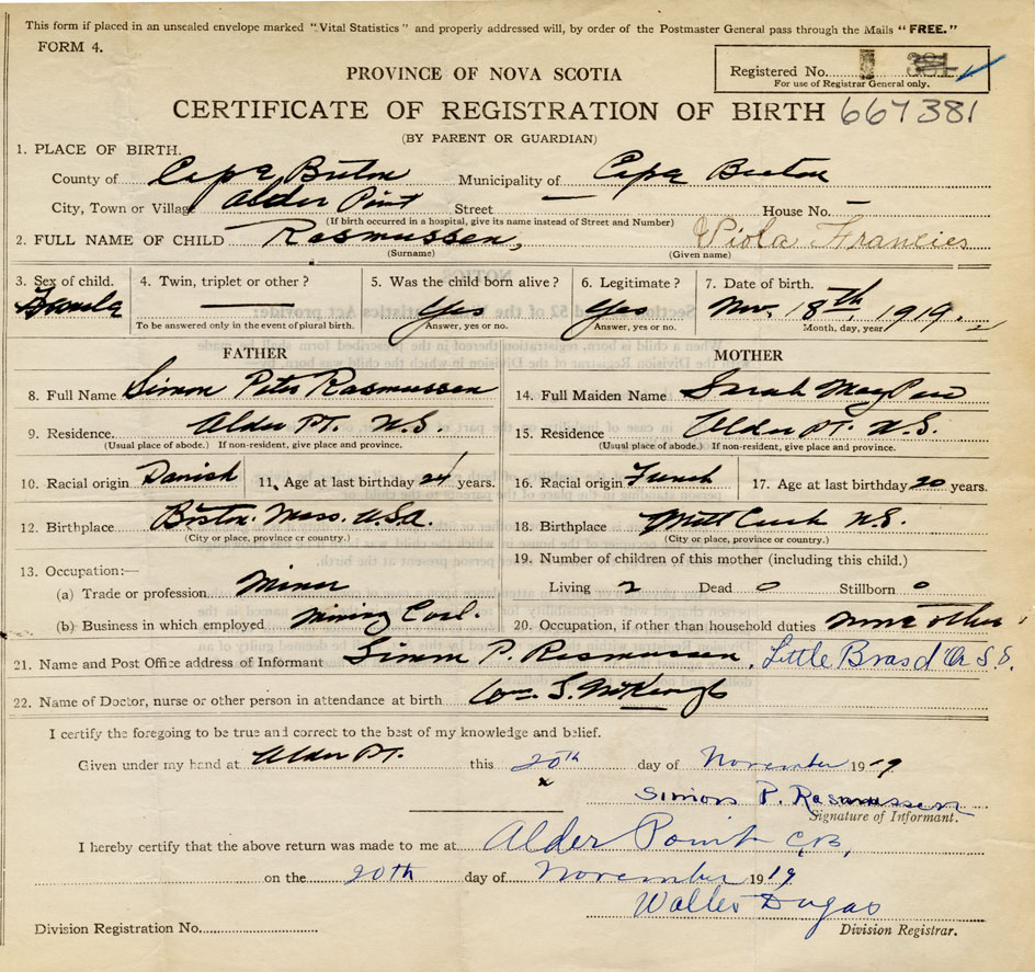 Date of Birth November 18, 1919 Place of Birth Alder PointCounty of Cape Breton