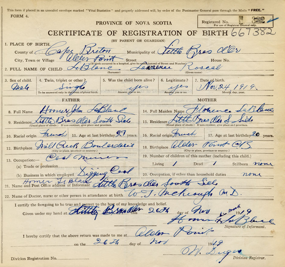 Date of Birth November 24, 1919 Place of Birth Alder PointCounty of Cape Breton