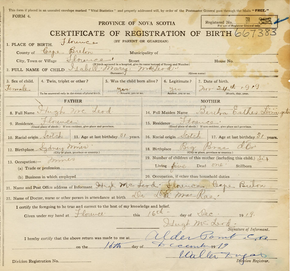 Name of Father Hugh McLeod MAIDEN NAME of Mother Bertha Esther Livingston