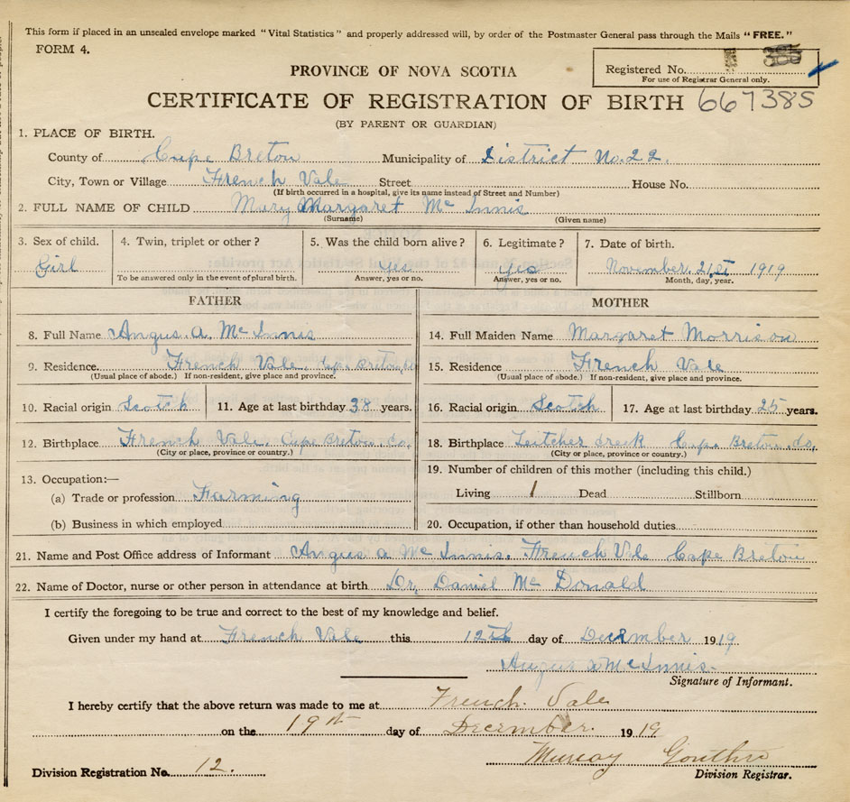 Name of Father Angus A. McInnis MAIDEN NAME of Mother Margaret Morrison