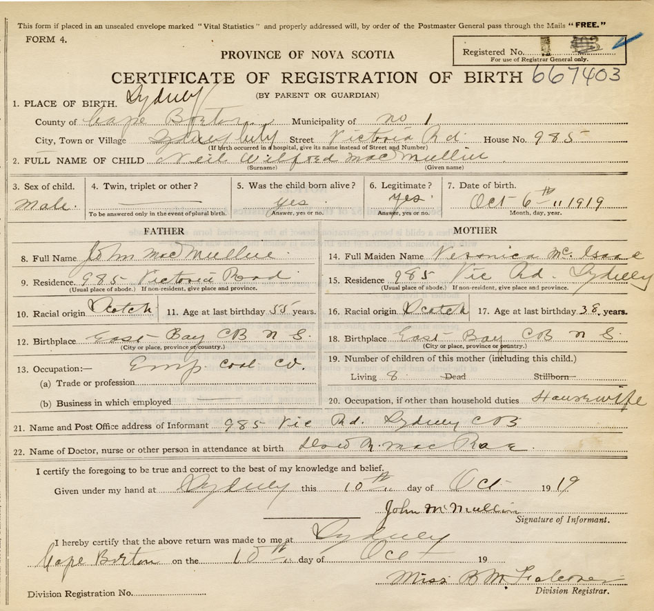 Date of Birth October 6, 1919 Place of Birth SydneyCounty of Cape Breton