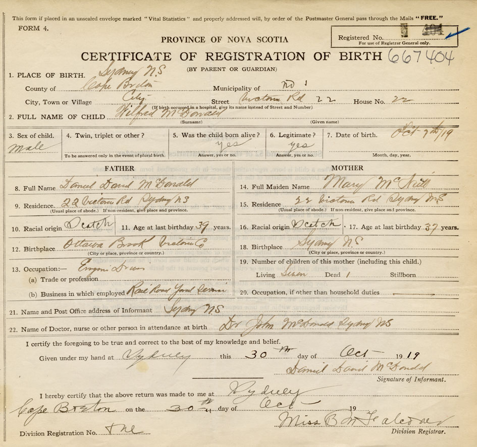 I hereby make application for the Registration of Birth of WilfredMcDonald Sex Male