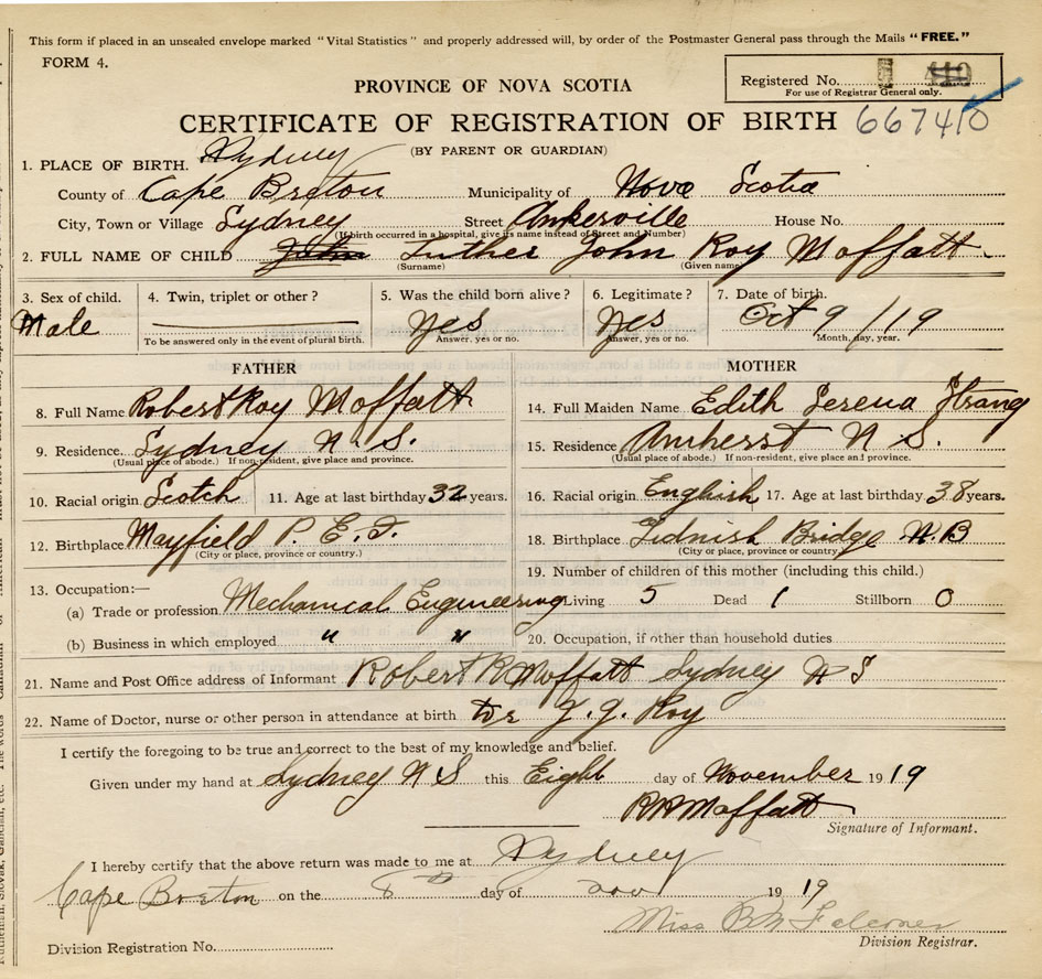 Name of Father Robert Roy Moffatt MAIDEN NAME of Mother Edith Serena Strang