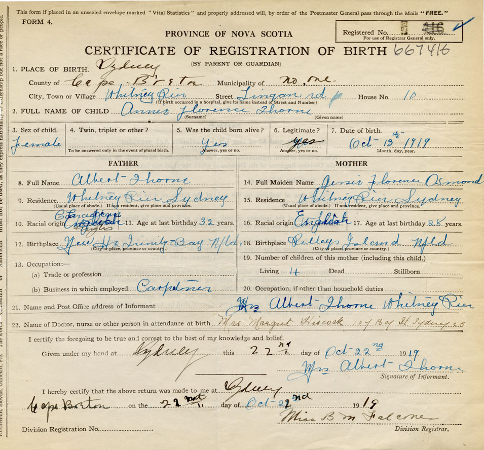 born at Sydney Cape Breton County on October 13, 1919