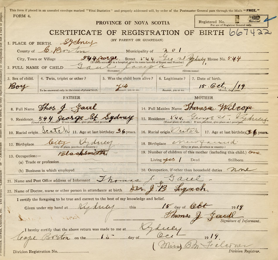 Date of Birth October 15, 1919 Place of Birth SydneyCounty of Cape Breton