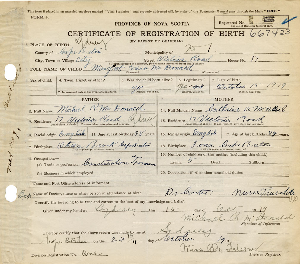 born at Sydney Cape Breton County on October 15, 1919