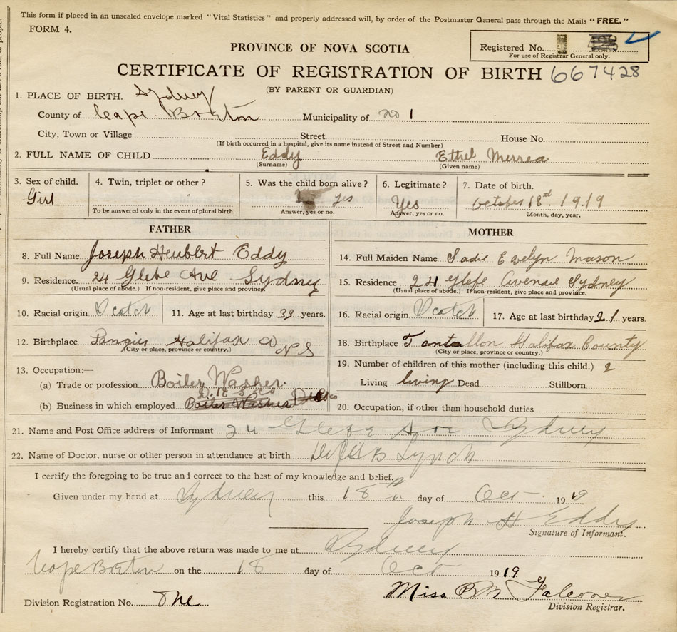 born at Sydney Cape Breton County on October 18, 1919